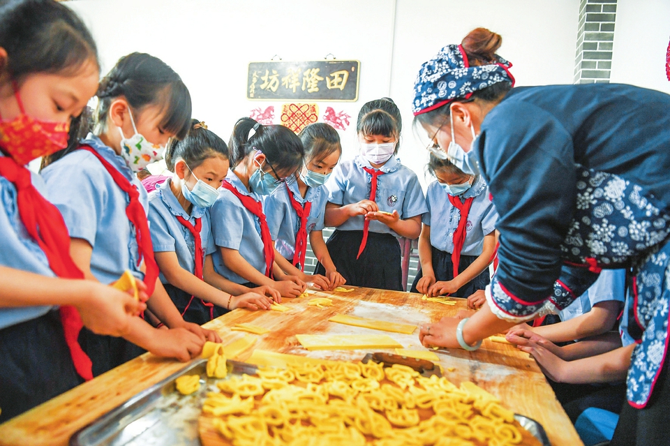 5月3日,平遙縣實(shí)驗(yàn)小學(xué)三年級(jí)463班的學(xué)生在平遙縣田隆祥油花花非遺傳學(xué)基地體驗(yàn)油花花、月餅等傳統(tǒng)食品的制作過程。“五一”期間,平遙縣實(shí)驗(yàn)小學(xué)在做好疫情防控的同時(shí),組織學(xué)生就地開展多種形式的非遺文化項(xiàng)目傳學(xué)活動(dòng),讓孩子們近距離感受非遺文化的魅力,豐富假期生活。(梁生仁攝)