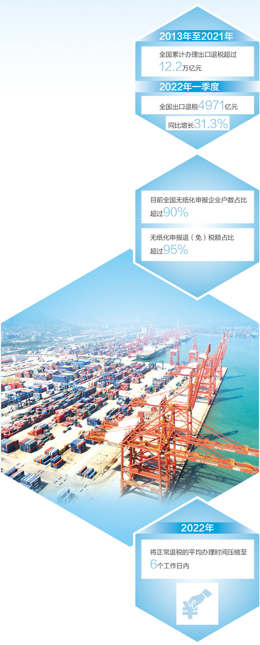 資金是企業(yè)的生命線。為助力外貿(mào)企業(yè)發(fā)展,財(cái)稅部門落實(shí)出口退稅政策,持續(xù)優(yōu)化出口退稅管理。2020年國(guó)家提高1464項(xiàng)產(chǎn)品的出口退稅率,稅務(wù)部門加強(qiáng)宣傳輔導(dǎo)、精準(zhǔn)推送,截至2021年底,共有9.4萬戶企業(yè)因這項(xiàng)政策受益,累計(jì)新增退稅377億元,進(jìn)一步增強(qiáng)了競(jìng)爭(zhēng)力和抗壓力。2021年,國(guó)家稅務(wù)總局以出口退稅信息系統(tǒng)整合優(yōu)化為契機(jī),大幅簡(jiǎn)并優(yōu)化退稅申報(bào)表單資料及辦稅流程,使出口退稅管理體系業(yè)務(wù)更全面、流程更優(yōu)化、權(quán)責(zé)更清晰、運(yùn)行更高效。