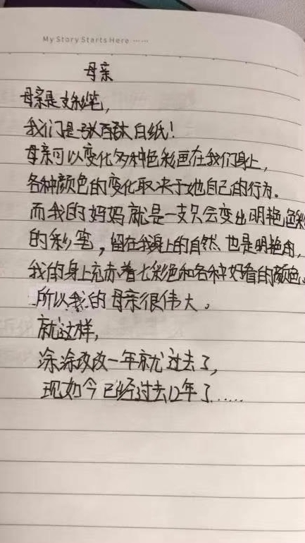 在與孩子們視頻通話時(shí),盛楠收到了一封來自大女兒親筆寫的信:“母親是支彩筆,我們是張白紙。母親可以變化多種色彩畫在我們身上,各種顏色的變化取決于她自己的行為。而我的媽媽就是一支只會(huì)變出明艷色彩的彩筆,留在我身上的自然也是明艷的,我的身上充斥著七彩色和各種好看的顏色,所以我的母親很偉大。就這樣,涂涂改改一年就過去了,現(xiàn)如今已經(jīng)過去12年了……”讀到這里盛楠濕潤(rùn)了眼眶。