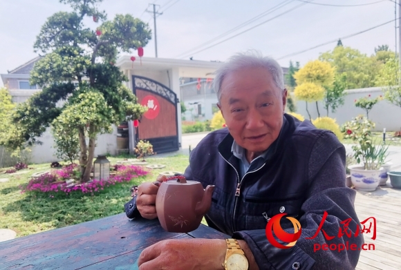 如皋市磨頭鎮(zhèn)十字橋村村民章少華正在自家修剪一新的庭院內(nèi)品茶。人民網(wǎng)記者 王繼亮攝