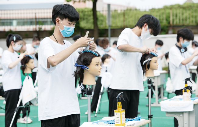 5月17日下午,金華電大(浙江貿(mào)易學(xué)校)舉辦2022年技能文化節(jié),該校美容美發(fā)與造型、烹飪、建筑、數(shù)字影像專業(yè)400多名學(xué)生,在學(xué)校操場(chǎng)上進(jìn)行職業(yè)技能展示比武,檢驗(yàn)所學(xué)專業(yè)水平。(時(shí)寬兵)