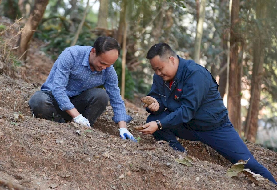 俞海奎(右一)正在指導(dǎo)農(nóng)戶種植天麻。龔旭東供圖