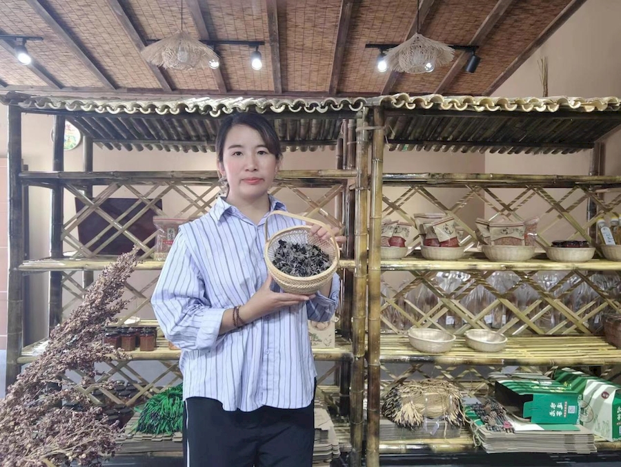 許金芝在她在改造的龐畈小學(xué)直播間內(nèi)展示農(nóng)特產(chǎn)品。龔旭東供圖
