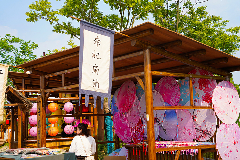 看罷演出,沿湖邊向東而行,是新近完善的“宋朝集市”?!盎㈩^鞋”“界首彩陶”“油紙傘”“古法燒制酒”等應有盡有,“小販們”則身著古裝,起勁吆喝,兜攬生意,再現(xiàn)當年宋朝集市的盛況。