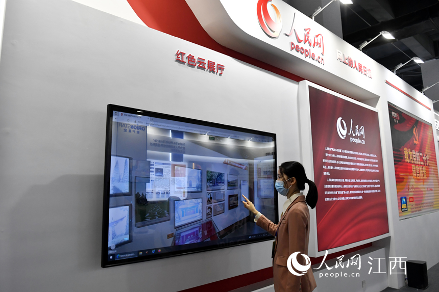 頭部文化企業(yè)展區(qū)的人民網(wǎng)展館內(nèi),工作人員正在調(diào)試紅色云展廳。人民網(wǎng) 時雨攝