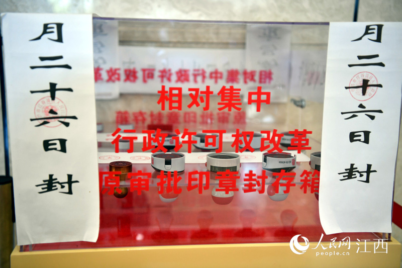 南昌紅谷灘區(qū)設(shè)立“難事直通車”專窗,優(yōu)化營商環(huán)境。圖為紅谷灘區(qū)行政審批局內(nèi)展示封存的原審批印章。人民網(wǎng) 時(shí)雨攝