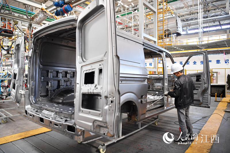 在江西省贛州市經(jīng)開區(qū)的一家汽車生產(chǎn)企業(yè)的車間里,工人們正在作業(yè)。人民網(wǎng) 時(shí)雨攝