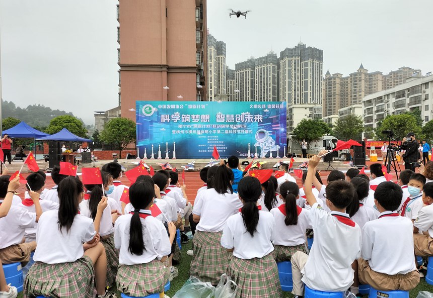 當(dāng)天,開幕式舉行了升國旗儀式,進行了“柳芽夢二號”、傘降火箭升空及放飛紙飛機活動。南寧市科技館展示了科學(xué)實驗秀、機器人舞蹈等節(jié)目;廣西航空運動管理中心進行了無人機集群編舞、遙控固定翼3D花式特技等航模飛行表演;柳明小學(xué)師生帶來了科普劇《綠色動員令》《科學(xué)用眼》,環(huán)保服裝走秀《美麗的四季》。開幕式結(jié)束后,蒙科祺還參觀指導(dǎo)了科技節(jié)校內(nèi)活動及學(xué)生作品。