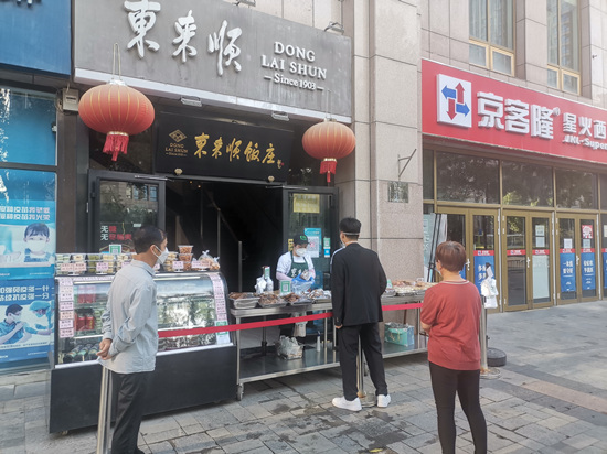 這個“五一”假期,老字號東來順王府井店不見了過往叫號等位的景象,取而代之的是服務(wù)員在門口引導(dǎo)、招呼顧客保持1米以上安全距離,有序排隊選購?fù)赓u食品。