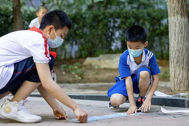陶然亭街道大吉巷社區(qū)的一處核酸點(diǎn)位上,兩米線安全提示標(biāo)識(shí)引起大伙兒注意。“避免聚集,嚴(yán)防疫情”“綠色出行,愛心助考”“文明陪考,安全第一”……誰(shuí)能想到這些醒目的標(biāo)語(yǔ)竟然是“陶然娃”們想的“愛心助考公約”?!榜R上就是高考了,希望哥哥姐姐們能取得好成績(jī),不辜負(fù)自己多年的努力?!?3歲的陳博一趴在地上,奮力的拍了拍自己剛剛貼好的“公約宣傳條”。