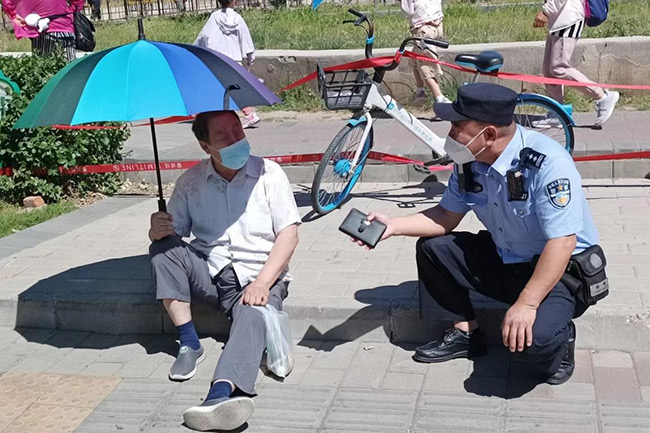 看到老人左腿從胯部開始已經(jīng)扭曲,無法動彈,馬占富勸說兩位老人:“這么大歲數(shù)摔倒可不是鬧著玩的,自行移動容易引起二次傷害?!彪S后,他撥打了120急救電話,疏散了圍觀群眾,還從車里拿來一把遮陽傘為老人遮擋陽光。