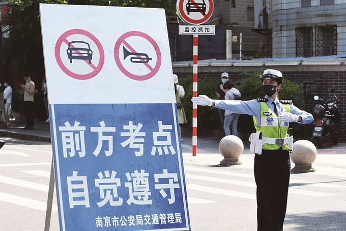 圖為南京市九中考點(diǎn)外,交警在執(zhí)勤。本報(bào)記者 吳俊 攝