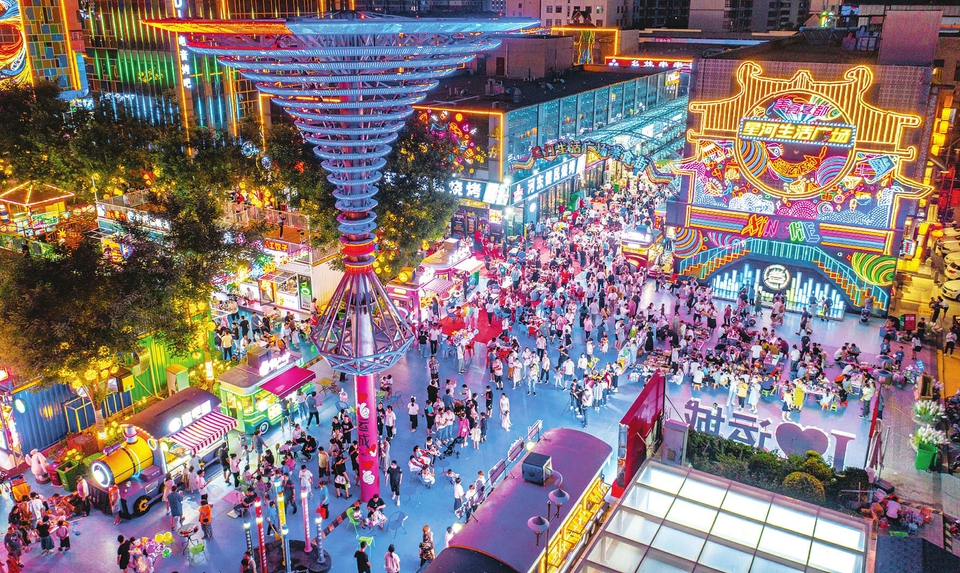 6月11日晚,市民在運城市鹽湖區(qū)星河生活廣場消夏。鹽湖區(qū)升級改造后的星河生活廣場燈光璀璨、人流如織,人們紛紛前來打卡、購物消費。(閆鑫攝)