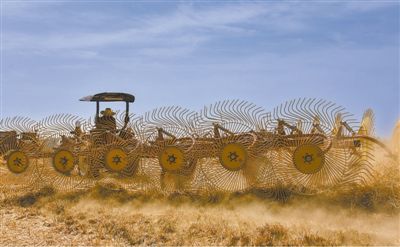 安徽省宿州市碭山縣張王莊村,農(nóng)機手駕駛摟草機將小麥秸稈回收打包,用于有機肥加工、生物質(zhì)發(fā)電、畜牧養(yǎng)殖等。