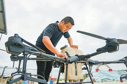 中江縣金穗源糧食專業(yè)合作社理事長(zhǎng)常滔在做無人機(jī)起飛前的準(zhǔn)備工作。四川日?qǐng)?bào)全媒體記者 李強(qiáng) 攝