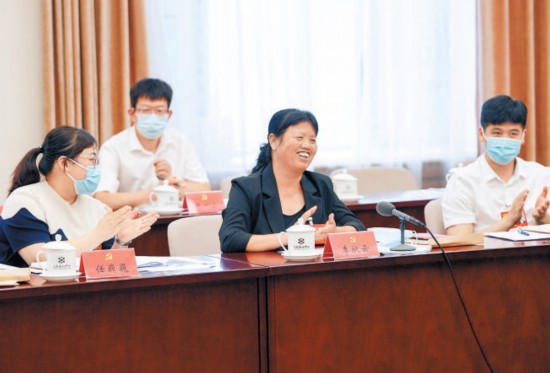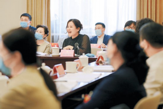 海淀代表團會議中,張海燕代表結(jié)合黨代會報告,就中小科技企業(yè)如何留住科技人才提出建議。 本報記者 賈同軍攝