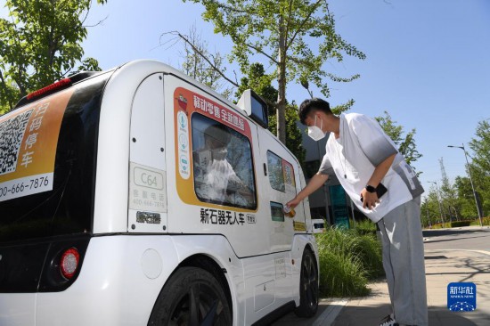 在雄安市民服務(wù)中心,市民在智能無(wú)人售賣(mài)車(chē)購(gòu)買(mǎi)飲料(2022年5月27日攝)。新華社記者 朱旭東 攝