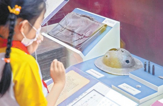 昨天,在中國人民抗日戰(zhàn)爭紀念館,《烽火印記——北京抗日戰(zhàn)爭主題片區(qū)特展》展廳內(nèi),參觀者在第29軍戰(zhàn)士的鋼盔前駐足。本報記者 武亦彬攝