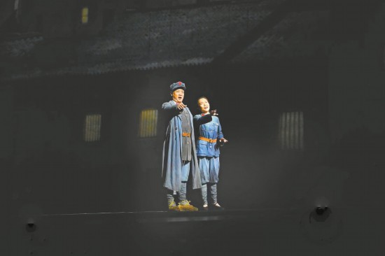 “閻老師可以再往前走幾步,要不然后面的合唱團一上來有點擠?!蔽枧_監(jiān)督陳歡用激光筆指了一下舞臺的前側(cè)區(qū)域。歌唱家閻維文點點頭,對臺下比了“OK”的手勢。燈光再次到位,排練繼續(xù),多媒體影像配合著兩側(cè)峭壁般聳立的舞美裝置,讓湘江翻涌的江水和咆哮的戰(zhàn)火穿越歷史,滾滾而來。