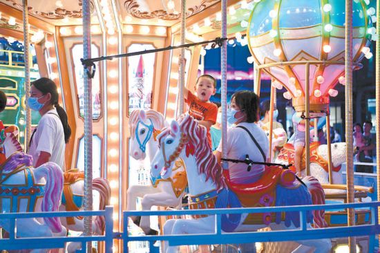 昨晚,北京經(jīng)開區(qū)大族廣場室外區(qū)域熱鬧非常,市民趁著夜色來這里吃飯、購物、游玩,廣場上的游樂設(shè)施前人頭攢動(dòng),孩子們在家長陪同下快樂玩耍。本報(bào)記者 和冠欣攝