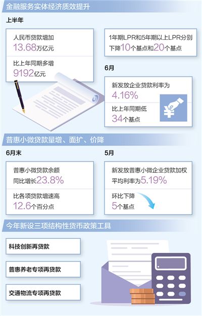 數(shù)據(jù)顯示,上半年,我國社會融資規(guī)模增量為21萬億元,同比多增3.2萬億元,人民幣貸款增加13.68萬億元,比上年同期多增9192億元。與此同時,央行持續(xù)釋放貸款市場報價利率(LPR)改革潛力,1年期LPR和5年期以上LPR分別下降10個基點和20個基點,6月份新發(fā)放企業(yè)貸款利率為4.16%,比上年同期低34個基點,企業(yè)綜合融資成本穩(wěn)中有降,金融服務(wù)實體經(jīng)濟的質(zhì)量和效率明顯提升。