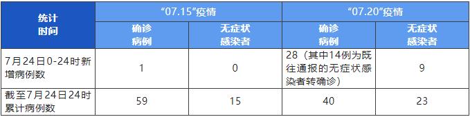 “07.15”疫情新增本土確診病例1例,無新增本土無癥狀感染者,系隔離管控中的密切接觸者。截至24日24時,本起疫情累計報告本土確診病例59例、本土無癥狀感染者15例。