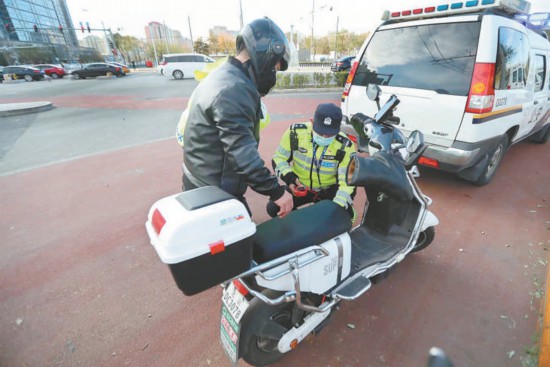 菜市口路口,西城區(qū)交通支隊(duì)民警對(duì)私自改裝電動(dòng)自行車的違法行為進(jìn)行查處。本報(bào)記者 甘南攝(資料片)