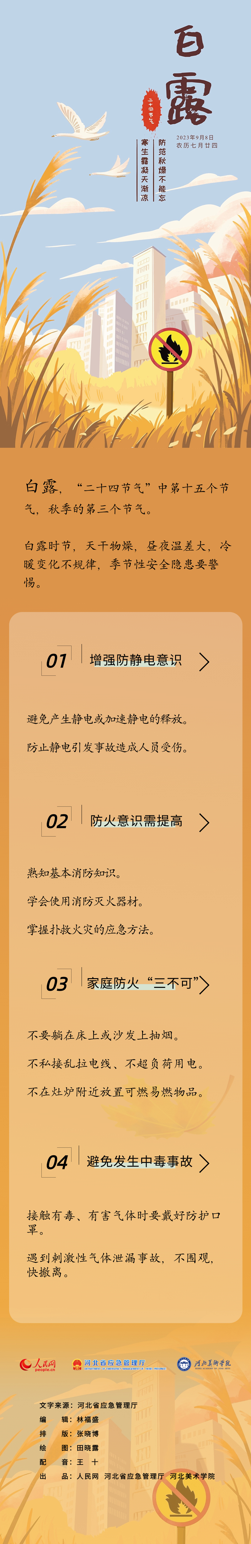 白露,“二十四節(jié)氣”中第十五個(gè)節(jié)氣,也是秋季的第三個(gè)節(jié)氣。白露時(shí)節(jié),天干物燥,晝夜溫差大,冷暖變化不規(guī)律,季節(jié)性安全隱患要警惕。近期,人民網(wǎng)與河北省應(yīng)急管理廳共同推出二十四節(jié)氣安全海報(bào)。今天,和小編一起來了解白露時(shí)節(jié),有哪些安全避險(xiǎn)小知識吧。