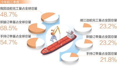 今年前三季度,我國造船完工量、新接訂單量和手持訂單量以載重噸計分別占全球總量的48.7%、68.5%和54.7%,均居世界第一。在江蘇泰州靖江市,當(dāng)?shù)卦齑髽I(yè)的訂單排到了2026年,成為我國船舶業(yè)轉(zhuǎn)型升級、穩(wěn)步向好的縮影。