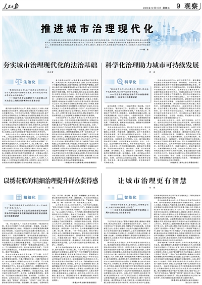 城市治理體系和治理能力現(xiàn)代化是國(guó)家治理體系和治理能力現(xiàn)代化的重要內(nèi)容。習(xí)近平總書(shū)記指出:“推進(jìn)國(guó)家治理體系和治理能力現(xiàn)代化,必須抓好城市治理體系和治理能力現(xiàn)代化。”總書(shū)記在上??疾鞎r(shí)強(qiáng)調(diào):“把增進(jìn)民生福祉作為城市建設(shè)和治理的出發(fā)點(diǎn)和落腳點(diǎn)”。本期觀察版圍繞如何提高城市治理法治化、科學(xué)化、精細(xì)化、智能化水平,更好推進(jìn)城市治理現(xiàn)代化、全面踐行人民城市理念進(jìn)行探討。
