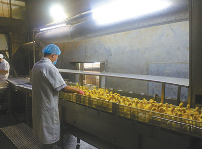 從孵化到養(yǎng)殖,從飼料到屠宰,榮達(dá)公司每個環(huán)節(jié)都嚴(yán)格控制,著力打造高質(zhì)量鴨肉品牌。“要讓消費(fèi)者吃得營養(yǎng)、吃得健康。”牛廣峰說。在優(yōu)質(zhì)肉鴨新品種培育方面,榮達(dá)公司建成了標(biāo)準(zhǔn)化育種場,主要用于優(yōu)質(zhì)雙黑白羽肉鴨選育,實現(xiàn)孵化場——養(yǎng)殖戶——屠宰廠——飼料廠產(chǎn)業(yè)鏈運(yùn)作經(jīng)營模式,各個環(huán)節(jié)協(xié)同推進(jìn)。