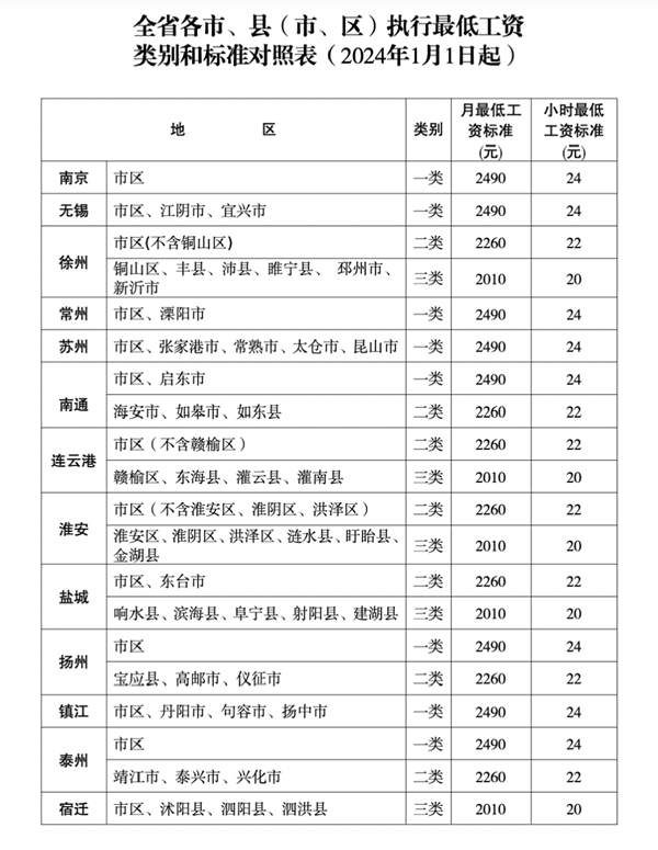 通知顯示,根據(jù)《最低工資規(guī)定》(原勞動(dòng)保障部令第21號(hào))和《江蘇省工資支付條例》規(guī)定,經(jīng)省人民政府同意,從2024年1月1日起調(diào)整全省最低工資標(biāo)準(zhǔn)。調(diào)整后,全省月最低工資標(biāo)準(zhǔn)為:南京、蘇州、無(wú)錫、常州、鎮(zhèn)江五市及南通市區(qū)、揚(yáng)州市區(qū)、泰州市區(qū)等一類地區(qū)2490元;徐州市區(qū)(不含銅山區(qū))、連云港市區(qū)(不含贛榆區(qū))等二類地區(qū)2260元;宿遷全市等三類地區(qū)2010元。非全日制用工小時(shí)最低工資標(biāo)準(zhǔn):一類地區(qū)24元,二類地區(qū)22元,三類地區(qū)20元。