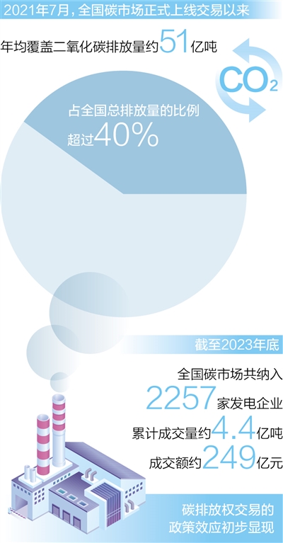 2021年7月全國碳市場正式上線交易以來,運(yùn)行整體平穩(wěn),年均覆蓋二氧化碳排放量約51億噸,占全國總排放量的比例超過40%。截至2023年底,全國碳市場共納入2257家發(fā)電企業(yè),累計(jì)成交量約4.4億噸,成交額約249億元,碳排放權(quán)交易的政策效應(yīng)初步顯現(xiàn)。