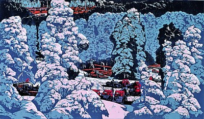 充滿粗獷刀味和雄渾之氣的色塊構(gòu)成,是晁楣版畫的魅力所在。他的藝術(shù)風(fēng)格從何而來?答案源于其在創(chuàng)作實(shí)踐中的自我體悟。在藝術(shù)創(chuàng)作中,晁楣深刻把握了藏與露、簡(jiǎn)與繁、整體與局部等多對(duì)概念之間的對(duì)立統(tǒng)一關(guān)系。與以人為主要表現(xiàn)對(duì)象的傳統(tǒng)黑白木刻有所不同,他的套色木刻以北大荒雄渾壯闊的風(fēng)景為主要題材。大色塊的構(gòu)成可以鮮明地表現(xiàn)山川、樹木的色彩關(guān)系,遠(yuǎn)景的人物因形象被縮小,化作外形概括的色塊,為畫面提供了精彩的細(xì)節(jié)。如《北方九月》《戰(zhàn)油海》《紅裝素裹》《秋歌》《松谷》等作品,皆是在鳥瞰式的場(chǎng)景中以大色塊鋪陳畫面,再將人、鷹、馬、車等物象轉(zhuǎn)化為斑斕的色塊點(diǎn)綴其中,使得作品既有宏觀的場(chǎng)景表現(xiàn),亦有微觀的敘事呈現(xiàn),兩者相得益彰、相映成趣,呈現(xiàn)出濃郁的個(gè)人創(chuàng)作風(fēng)格。