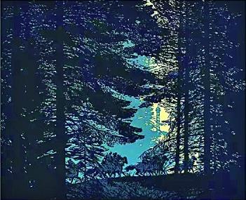 面對(duì)彼時(shí)套色木刻創(chuàng)作存在的這一問題,晁楣通過不懈研究與探索找到了解決的方法。他放棄了過去以黑線勾勒輪廓再以彩色填充的方式,大膽采用色塊拼接的新方法,將黑色與彩色并置在畫面中,使黑色輪廓線融入暗部,統(tǒng)一為一個(gè)個(gè)整體色塊。晁楣強(qiáng)調(diào),套色木刻中不能沒有黑色,因?yàn)樗诋嬅嬷邪l(fā)揮著重要的作用。這種“剪影式”的構(gòu)圖大量削減了輪廓線在畫面中的應(yīng)用,帶來強(qiáng)烈的色彩對(duì)比以及極具視覺張力的疏密關(guān)系,使得畫面結(jié)構(gòu)主次分明,保持了作品的整體感。試看晁楣的套色木刻作品《北陲屏障》,逆光的環(huán)境中,頂天立地、枝繁葉茂的松樹剪影占據(jù)了畫面的大部分空間,在遠(yuǎn)處光源的照耀下,一隊(duì)騎乘戰(zhàn)馬的巡邏兵疾馳而過,形成了動(dòng)靜交織的畫面節(jié)奏。作品用為數(shù)不多的色彩營造光感,套色簡(jiǎn)潔自然,茂密枝干交織形成的無數(shù)小色塊,展現(xiàn)出藝術(shù)家精湛的運(yùn)刀技藝。