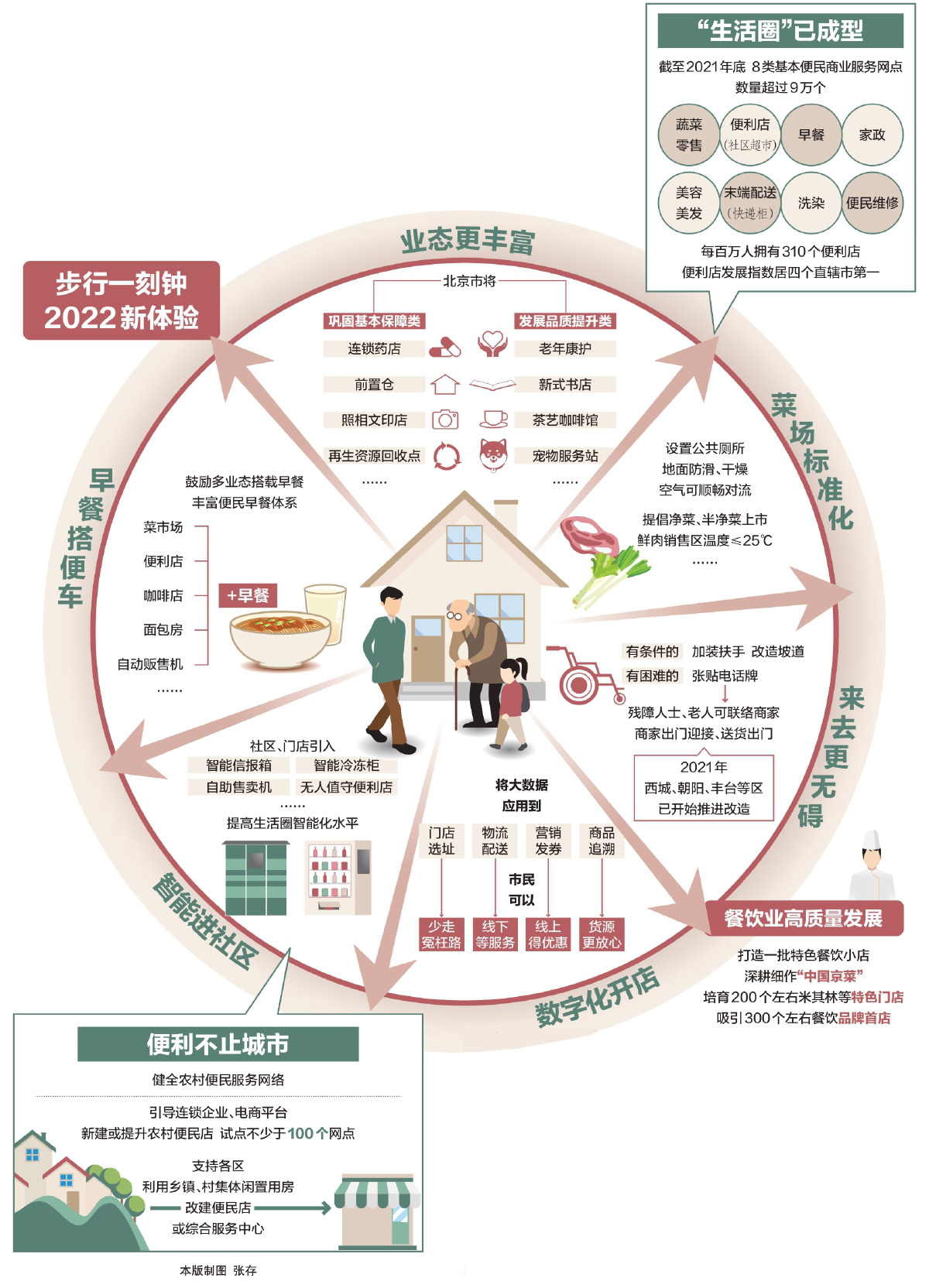 走出家門15分鐘內(nèi),有熱氣騰騰的早餐、新鮮上架的蔬果,修車、理發(fā)、取快遞一趟全部辦妥。截至2021年底,全市蔬菜零售、便利店(社區(qū)超市)、早餐、家政等8類基本便民商業(yè)網(wǎng)點(diǎn)超過9萬個,“一刻鐘便民生活圈”歷經(jīng)十余年建設(shè)輪廓已現(xiàn)。市商務(wù)局2022年將加快打造“一刻鐘便民生活圈”,優(yōu)化資金支持方向,優(yōu)先支持在便民設(shè)施不足區(qū)域新建亟須業(yè)態(tài)網(wǎng)點(diǎn),從豐富業(yè)態(tài)、加快智能化數(shù)字化、餐飲業(yè)高質(zhì)量發(fā)展等方面入手提升“生活圈”體驗(yàn)。 本報記者 馬婧 白歌