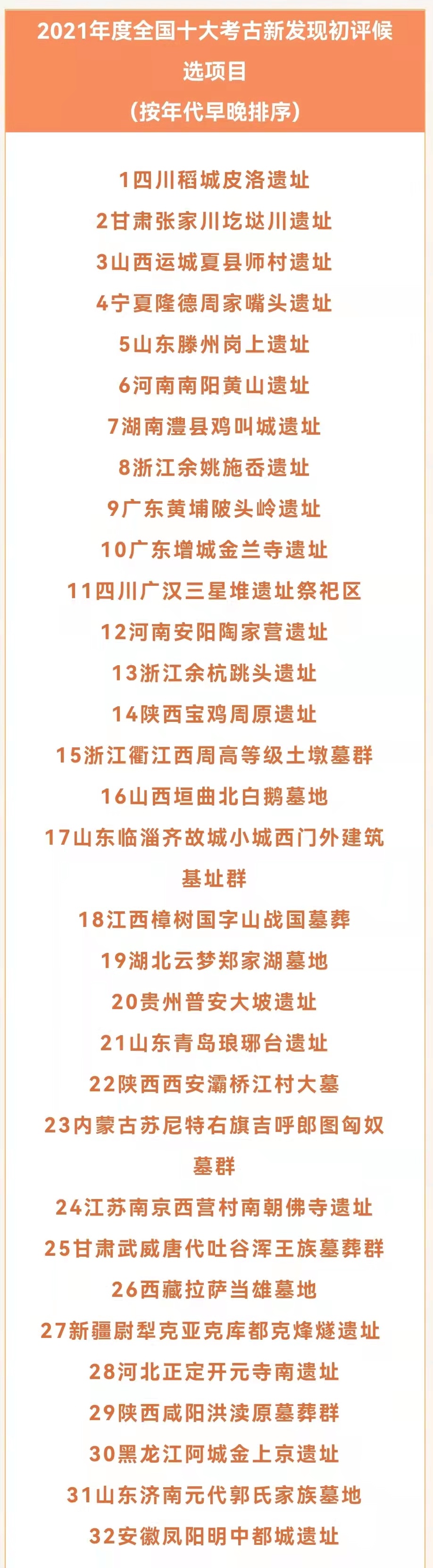 2021年,全國經(jīng)過審批的考古發(fā)掘1700余項。候選項目均為各發(fā)掘資質(zhì)單位主動申報,經(jīng)國家文物局審核,最終確定32項參評(名單如下)。評選活動辦公室將組織投票推薦產(chǎn)生20項進(jìn)入終評。