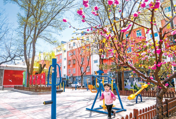 大興區(qū)興豐街道老小區(qū)黃村西里社區(qū)在居民的共同維護(hù)下,居住環(huán)境整潔舒適。圖為提升后的社區(qū)廣場(chǎng)上,小朋友正在樂享春光。本報(bào)記者 武亦彬攝