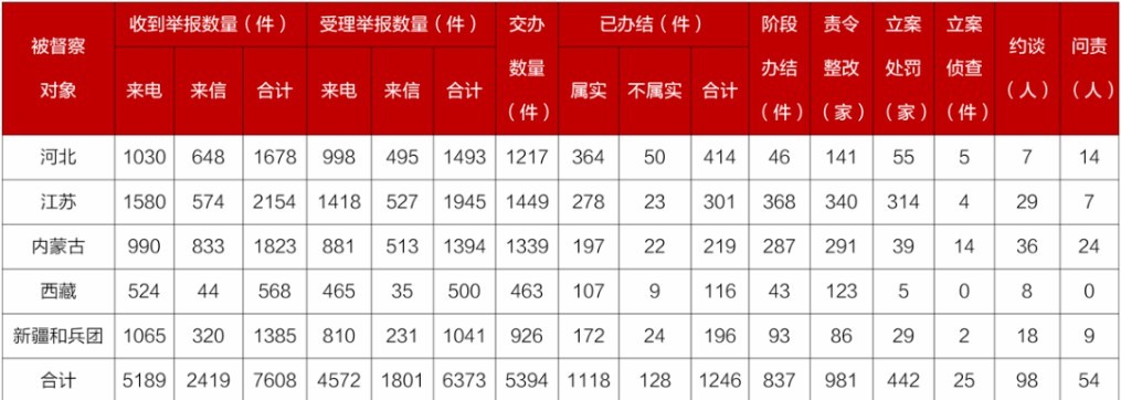 截至4月10日22時(shí),各督察組共收到群眾來電、來信舉報(bào)7608件,受理有效舉報(bào)6373件,經(jīng)梳理合并重復(fù)舉報(bào),累計(jì)向被督察對象轉(zhuǎn)辦5394件;被督察對象已辦結(jié)或階段辦結(jié)2083件,其中立案處罰442家;立案偵查25件;約談黨政領(lǐng)導(dǎo)干部98人,問責(zé)黨政領(lǐng)導(dǎo)干部54人。