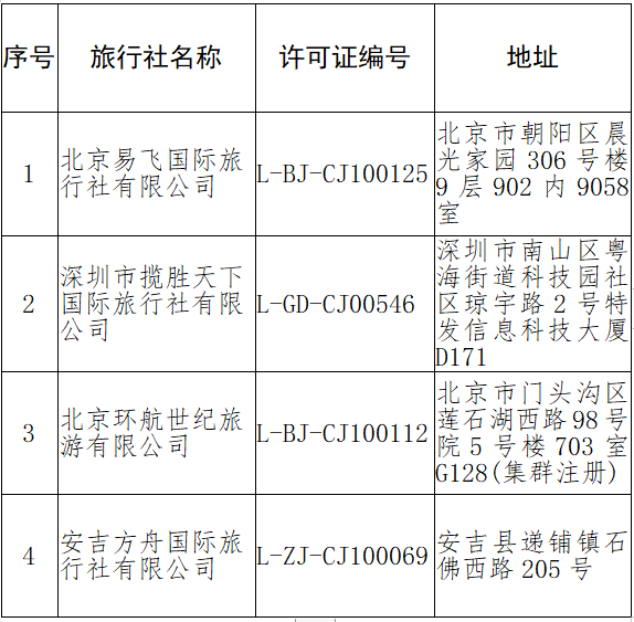 央廣網(wǎng)北京4月12日消息 據(jù)文化和旅游部消息,根據(jù)《旅行社條例》和《中國(guó)公民出國(guó)旅游管理辦法》,文旅部發(fā)布關(guān)于《取消以下4家旅行社經(jīng)營(yíng)出境旅游業(yè)務(wù)》的公告:自2022年4月7日起,取消以下4家旅行社經(jīng)營(yíng)出境旅游業(yè)務(wù)。