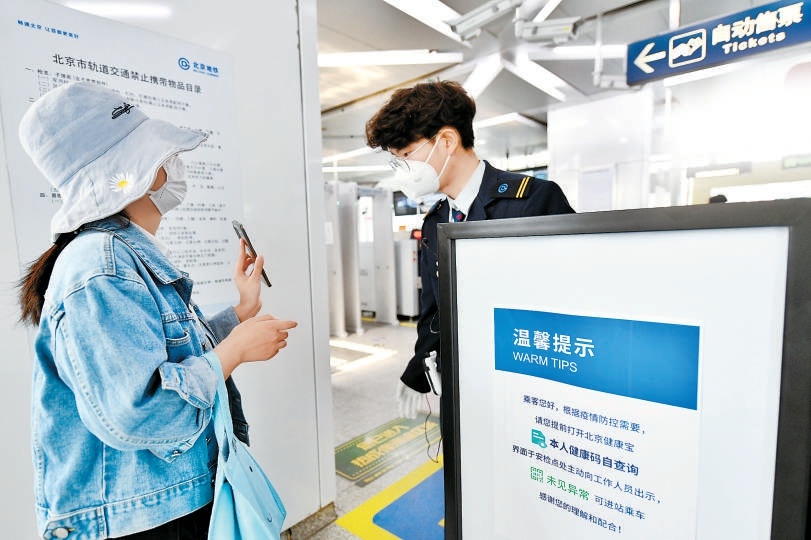 17日早晨,在北京地鐵5號(hào)線北苑路北站,地鐵安檢人員在進(jìn)站安檢口檢查乘客健康碼。本報(bào)記者 鄧偉攝