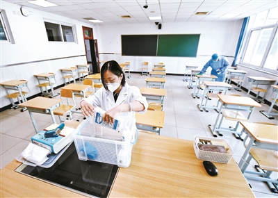 今年高考期間,作為常規(guī)考點(diǎn)之一的東直門中學(xué)考點(diǎn)將設(shè)置13個(gè)常規(guī)考場(chǎng)、3個(gè)備用考場(chǎng)。熊勁介紹,當(dāng)遇到發(fā)熱考生時(shí),考點(diǎn)考務(wù)人員會(huì)立即將發(fā)熱考生通過(guò)專門進(jìn)口帶進(jìn)考點(diǎn)內(nèi)的隔離室,進(jìn)行健康觀察。為了防止交叉,考點(diǎn)為發(fā)熱考生設(shè)置專門進(jìn)入考點(diǎn)的通道。