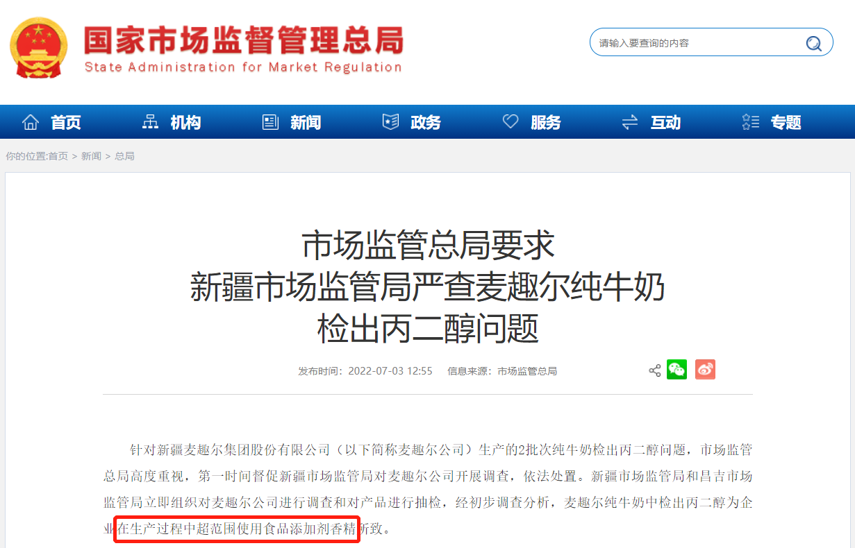 7月3日,國家市場監(jiān)管總局發(fā)布消息,要求“嚴(yán)查麥趣爾純牛奶檢出丙二醇問題”,并表示“經(jīng)初步調(diào)查分析,麥趣爾純牛奶中檢出丙二醇為企業(yè)在生產(chǎn)過程中超范圍使用食品添加劑香精所致。”