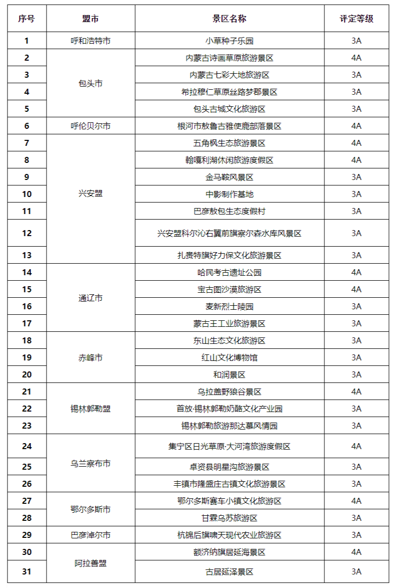 內(nèi)蒙古2022年擬確定國家4A級和3A級旅游景區(qū)共31家