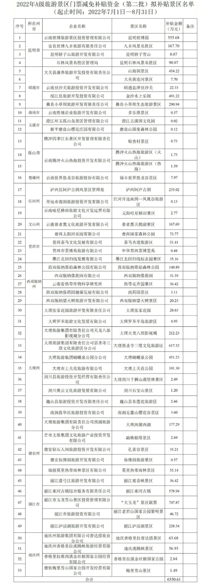 云南省公布2022年A級(jí)旅游景區(qū)門票(第二批)擬補(bǔ)貼景區(qū)名單