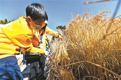 昨天上午,北京青年報記者來到先農(nóng)壇,觀耕臺前的一畝三分地上,水稻已經(jīng)成熟,稻穗在陽光下隨風搖曳,煥發(fā)出金燦燦的光澤,構(gòu)成獨特的古都秋景。隨著主持人開鑼、小朋友們齊喊“豐收嘍”,收割儀式正式開始。在場嘉賓和10名小朋友一起收割第一鐮新稻子,寓意豐收碩果新開始。