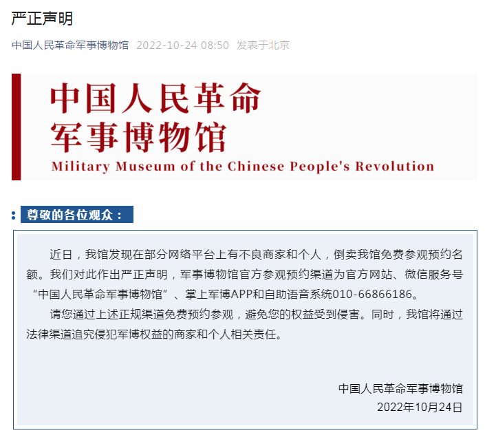 近日部分網(wǎng)絡(luò)平臺上有商家和個人倒賣該館免費(fèi)參觀預(yù)約名額。對此,軍博嚴(yán)正聲明,該館參觀預(yù)約渠道為官方網(wǎng)站、微信服務(wù)號“中國人民革命軍事博物館”、掌上軍博APP和自助語音系統(tǒng)010-66866186。觀眾要通過上述正規(guī)渠道免費(fèi)預(yù)約參觀,避免權(quán)益受到侵害。同時,該館將通過法律渠道追究侵犯軍博權(quán)益的商家和個人相關(guān)責(zé)任。