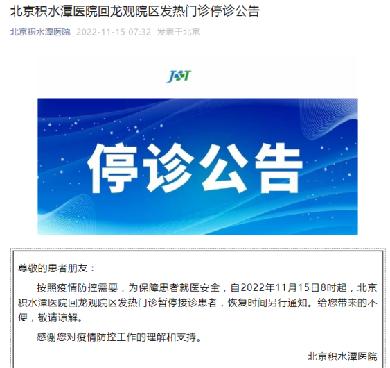 據(jù)北京積水潭醫(yī)院微信公眾號(hào)消息,按照疫情防控需要,為保障患者就醫(yī)安全,自2022年11月15日8時(shí)起,北京積水潭醫(yī)院回龍觀院區(qū)發(fā)熱門診暫停接診患者,恢復(fù)時(shí)間另行通知。給您帶來的不便,敬請(qǐng)諒解。