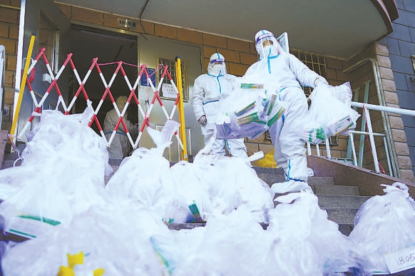 近日,朝陽區(qū)東湖街道利澤西園一區(qū)社區(qū)“大白”逐戶為封控居民送抗原試劑盒,分發(fā)蔬菜包等生活必需品。 本報記者 程功攝