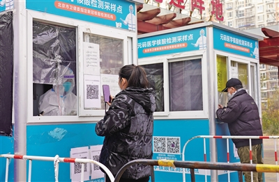 11月23日,朝陽區(qū)鴻博家園第四社區(qū),居民掃碼登記進(jìn)行核酸檢測。 新京報(bào)記者 王飛 攝